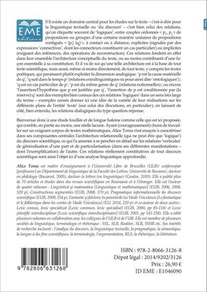 Cet ouvrage propose une étude fouillée, de longue haleine, qui comble une réelle lacune. Ayant choisi de travailler sur un exigeant corpus de textes mathématiques, l'auteur s'est essayée à caractériser dans ses composantes centrales l'architecture relationnelle ("logique") du discours scientifique, ce qui l'a amenée à se pencher sur les relations "verticales" de généralisation et de particularisation. Ces relations constitutives du discours scientifique sont l'objet d'une analyse linguistique approfondie.