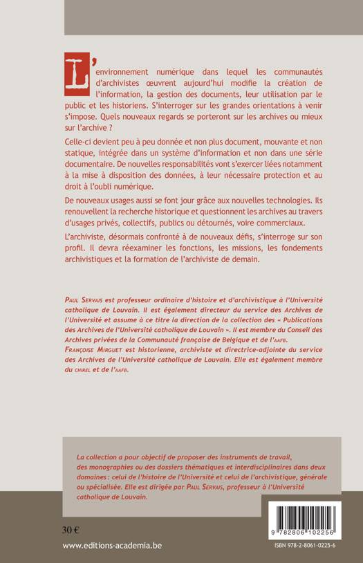 L'environnement numérique dans lequel les communautés d'archivistes uvrent aujourd'hui modifie la création de l'information, la gestion des documents, leur utilisation par le public et les historiens. Quels nouveaux regards se porteront sur les archives ? Quelles nouvelles responsabilités ? Quels nouveaux usages ? À quels nouveaux défis les archivistes de demain seront-ils confrontés ? Ils devront assurément réexaminer les fondements archivistiques, leurs fonctions, leurs missions et leur formation.