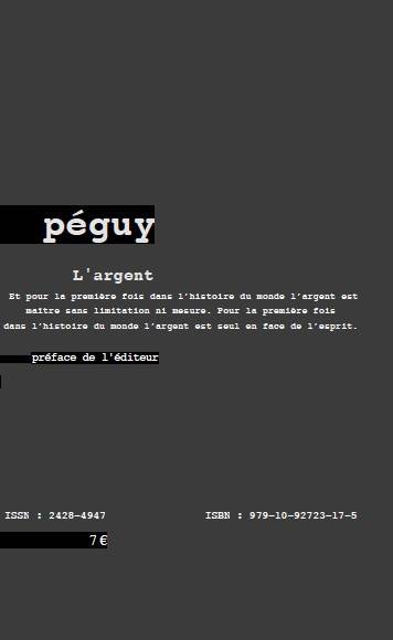 " Et pour la première fois dans l'histoire du monde l'argent est maître sans limitation ni mesure. Pour la première fois dans l'histoire du monde l'argent est seul en face de l'esprit. " Charles Péguy