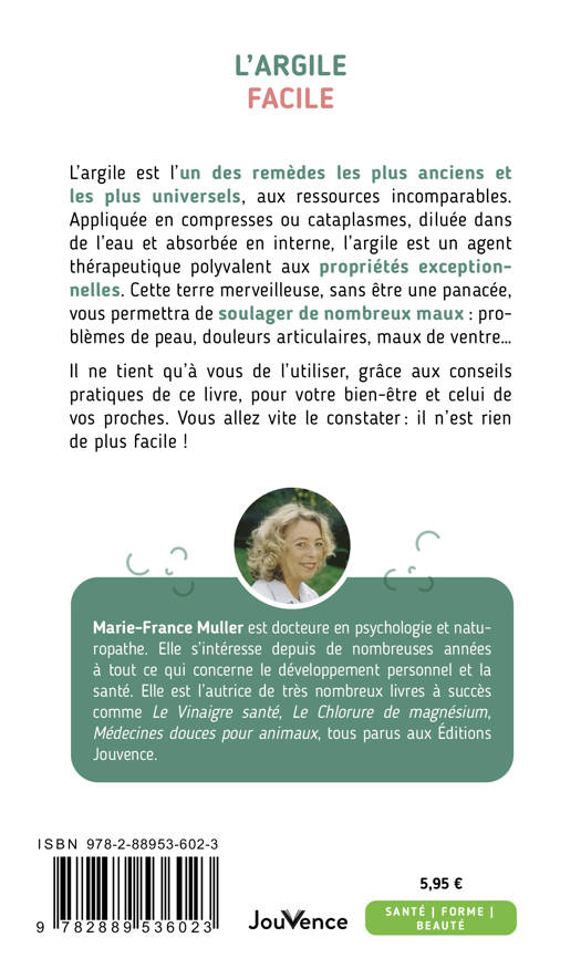 Appliquée en compresses ou cataplasmes, diluée dans de l’eau et absorbée en interne, l’argile est un agent thérapeutique polyvalent aux propriétés exceptionnelles. Cette terre merveilleuse, sans être une panacée, vous permettra de soulager de nombreux maux : problèmes de peau, douleurs articulaires, maux de ventre… Il ne tient qu’à vous de l’utiliser, grâce aux conseils pratiques de ce livre, pour votre bien-être et celui de vos proches. Vous allez vite le constater?: il n’est rien de plus facile !