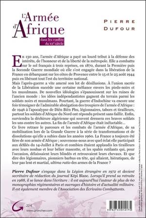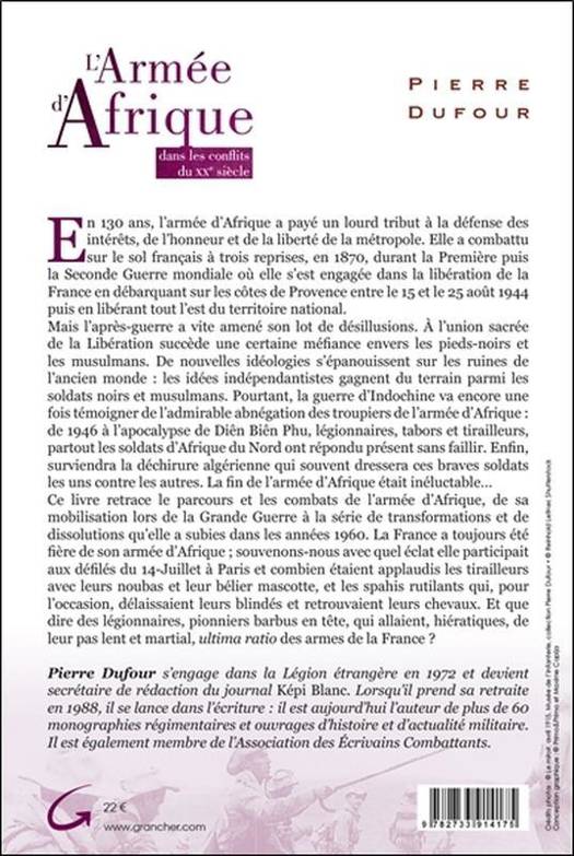 En 130 ans, l'armée d'Afrique a payé un lourd tribut à la défense des intérêts, de l'honneur et de la liberté de la métropole. Elle a combattu sur le sol français à trois reprises, en 1870, durant la Première puis la Seconde Guerre mondiale où elle s'est engagée dans la libération de la France en débarquant sur les côtes de Provence entre le 15 et le 25 août 1944 puis en libérant tout l'est du territoire national. Mais l'après-guerre a vite amené son lot de désillusions. À l'union sacrée de la Libération succède une certaine méfiance envers les pieds-noirs et les musulmans. De nouvelles idéologies s'épanouissent sur les ruines de l'ancien monde : les idées indépendantistes gagnent du terrain parmi les soldats noirs et musulmans. Pourtant, la guerre d'Indochine va encore une fois témoigner de l'admirable abnégation des troupiers de l'armée d'Afrique : de 1946 à l'apocalypse de Diên Biên Phu, légionnaires, tabors et tirailleurs, partout les soldats d'Afrique du Nord ont répondu présent sans faillir. Enfin, surviendra la déchirure algérienne qui souvent dressera ces braves soldats les uns contre les autres. La fin de l'armée d'Afrique était inéluctable… Ce livre retrace le parcours et les combats de l'armée d'Afrique, de sa mobilisation lors de la Grande Guerre à la série de transformations et de dissolutions qu'elle a subies dans les années 1960. La France a toujours été fière de son armée d'Afrique ; souvenons-nous avec quel éclat elle participait aux défilés du 14 Juillet à Paris et combien étaient applaudis les tirailleurs avec leurs noubas et leur bélier mascotte, et les spahis rutilants qui, pour l'occasion, délaissaient leurs blindés et retrouvaient leurs chevaux. Et que dire des légionnaires, pionniers barbus en tête, qui allaient, hiératiques, de leur pas lent et martial, ultima ratio des armes de la France ?