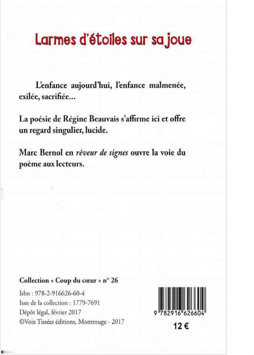 L'enfance, temps béni des dieux, ici passée au crible des étoiles, des rêves, de l'existence qui fera de l'enfant un adulte, si possible. L'enfance aujourd'hui sous les deux regards, celui de l'autrice et celui de l'artiste, Marc Bernol qui reprend un vers de Régine Beauvais pour chaque création graphique.<br /> "Y a-t-il un possible/ pour l'enfant du Sahel ? / La poussière de la ville / n'a jamais fait de fleurs, / Elle accable la rue / Où l'enfant cherche l'aube [...]