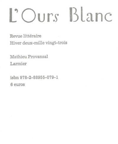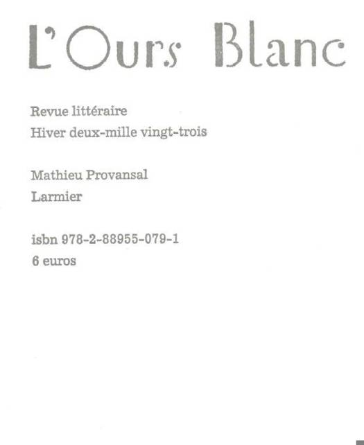 Le numéro 36 de L’Ours Blanc réunit trois récits de Mathieu Provansal : "L’auteur nous gâte" suivi de "La goutte" et "Théâtre oval". Ils semblent autant autobiographiques que fictionnels, sans qu’il soit possible de déceler en eux la part de l’invention et celle de la confession, n’était la précision avec laquelle sont décrites les émotions et les pensées du narrateur ou des personnages.