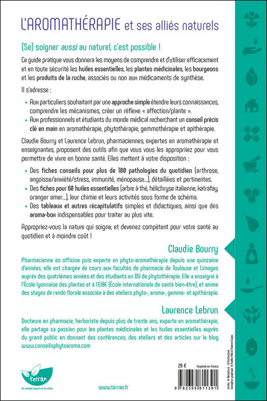 Ce guide pratique vous donnera les moyens de comprendre et d’utiliser efficacement et en toute sécurité les huiles essentielles, les plantes médicinales, les bourgeons et les produits de la ruche, associés ou non aux médicaments de synthèse. Il s’adresse aux particuliers souhaitant par une approche simple étendre leurs connaissances, et aux professionnels et étudiants du monde médical. Les auteures proposent des outils afin que vous vous les appropriiez pour vous permettre de vivre en bonne santé. Elles mettent à votre disposition : des fiches conseils pour plus de 100 pathologies du quotidien (arthrose, angoisse/anxiété/stress, immunité, ménopause…), détaillées et pertinentes ; des fiches pour 60 huiles essentielles (arbre à thé, hélichryse italienne, katrafay, oranger amer…), leur chimie et leurs activités sous forme de schéma.