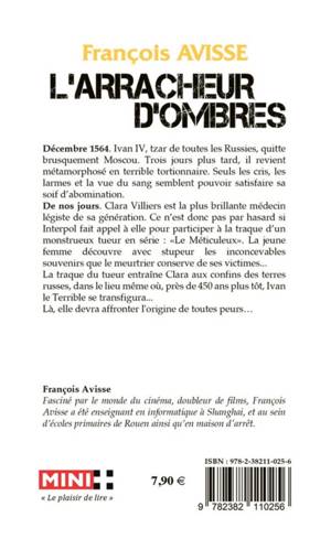 La jeune américaine Clara, brillant médecin légiste de la CIA, est appelée à la rescousse par Scotland Yard confronté à des cadavres effroyablement suppliciés, pour aider dans sa recherche le Professeur Lawrence Bergerrmann, expert pourtant chevronné. Entre Londres et Moscou, Clara et le Professeur découvrent un même mode opératoire terrifiant de sadisme et une même tache de dépigmentation en guise de signature, qui leur rappellent de sinistres personnages de l'histoire, Ivan Le Terrible ou Jacques l'éventreur. Les limiers anglais ont qualifié leur cible : « Le Méticuleux ». Qui est ce tueur en série, et par quelle opération le processus cauchemardesque qu'il emploie traverse-t-il les siècles et les continents ? Où se trouve l'origine de ce mal absolu qui déjoue le passage du temps ? Clara et le Professeur convaincus de trouver la clef de l'énigme en Russie, gagneront-ils la course de vitesse que semble leur imposer l'arracheur d'ombre, ennemi insaisissable qui, lui, se saisit des hommes ?