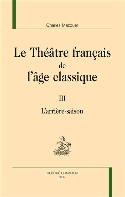 Le présent ouvrage rend bien compte d'une arrière-saison - surtout si on compare cette période, qui va de la création de la Comédie-Française à la fin du siècle, avec la haute floraison du classicisme des années 1660. C'est que la vie théâtrale est tributaire alors d'un contexte historique, politique et idéologique bien peu favorable. Néanmoins, pour la toute petite partie de la société française qui se passionne pour le théâtre, les propositions de spectacles demeurent, un peu paradoxalement, fort importantes, et méritent une analyse précise.