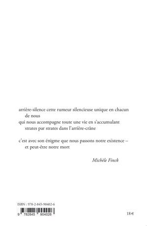 ici Michèle Finck est une contrée purement intérieure : « arrière-silence cette rumeur silencieuse unique en chacun de nous / qui nous accompagne toute une vie en s'accumulant strates par strates dans l'arrière-crâne / c'est avec son énigme que nous passons notre existence - et peut-être notre mort ».