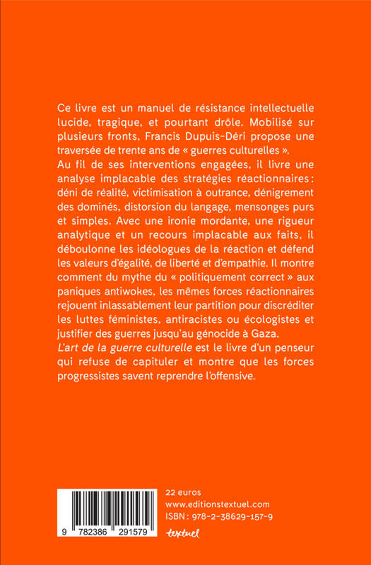 Dans ce manuel de résistance intellectuelle, Francis Dupuis-Déri raconte de l'intérieur trente ans de « guerres culturelles », du mythe du « politiquement correct » aux offensives anti-wokes. Son analyse incisive démonte les stratégies réactionnaires, éclaire les paniques morales successives et offre des clés pour comprendre les controverses idéologiques qui structurent notre époque. Un ton rare, à la fois lucide, vif et parfois tragique, celui d'un penseur qui refuse de capituler.