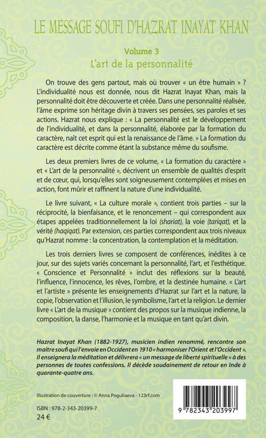 On trouve des gens partout, mais où trouver « un être humain » ? L'individualité nous est donnée, nous dit Hazrat Inayat Khan, maître soufi, mais la personnalité doit être découverte et créée. Les deux premiers livres de ce volume, « La formation du caractère » et « L'art de la personnalité » décrivent un ensemble de qualités d'esprit et de coeur, qui, lorsqu'elles sont contemplées et mises en action, font mûrir et raffinent la nature d'une individualité. De même le troisième livre « La culture morale ». La dernière partie du volume contient des conférences sur des sujets variés en relation avec la personnalité, l'art et l'esthétique.