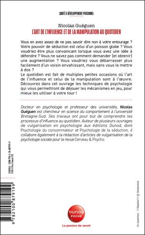 Vous en avez assez de ne pas savoir dire non à votre entourage ? Votre pouvoir de séduction est celui d’un poisson globe ? Vous voudriez être plus convaincant lorsque vous avez une idée à défendre ? Vous ne savez pas comment demander (et obtenir) une augmentation ? Vous voudriez vous débarrasser plus facilement d’un voisin envahissant, mais sans vous le mettre à dos ? Le quotidien est fait de multiples petites occasions où l’art de l’influence et celui de la manipulation sont à l’oeuvre. Découvrez dans cet ouvrage les techniques de psychologie qui vous permettront de déjouer les mécanismes en jeu, pour mieux les utiliser à votre tour !