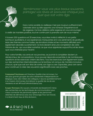 Pour votre famille, vos amis et vos proches, ce journal à compléter devient un déclencheur de conversations. Vous pouvez répondre ensemble à de nombreuses questions et les exercices créent des liens. Tous les exercices sont également basés sur des recherches internationales sur le bonheur et conçus de manière inclusive : chacun, quel que soit son état de santé, son âge ou ses capacités, peut s'en servir pour continuer à créer des souvenirs significatifs avec ses proches.