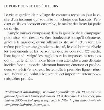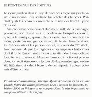 Simple ouvrier croupissant dans la grisaille de la campagne polonaise, son destin va être bouleversé lorsqu'il découvre, grâce à la musique, qu'un ailleurs existe. Au fil d'un récit lui-même porté par une grande musicalité, le vieil homme révèle les événements et les personnes qui, au cours du XXe siècle, l'ont façonné. Malgré les tragédies et les impasses historiques dont il fut le témoin, notre héros a su atteindre à une délicate lucidité face au monde. Alternant humour, émotion et profondeur, son récit s'empare du lecteur dès la première ligne - réussite littéraire qui valut à l'oeuvre de cet important auteur polonais d'être primée.
