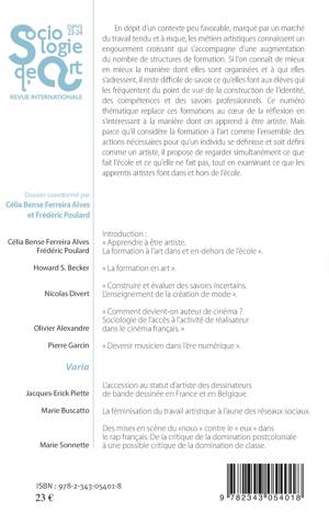 En dépit d'un contexte peu favorable, marqué par un marché du travail tendu et à risque, les métiers artistiques connaissent un engouement croissant qui s'accompagne d'une augmentation du nombre de structures de formation. Si l'on connait de mieux en mieux la manière dont elles sont organisées et à qui elles s'adressent, il reste difficile de savoir ce qu'elles font aux élèves qui les fréquentent du point de vue de la construction de l'identité, des compétences et des savoirs professionnels.