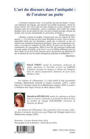How to do things with words ? Une première réponse est dans ce livre qui résulte des communications faites au cours d'une Journée d'Etudes qui a eu lieu a Pau, au lycée Louis Barthou, le vendredi 2 avril 2010. La réflexion s'oriente sur le lien qui s'établit entre l'orateur et le poète par le medium de l'art du discours, comme s'attache à le montrer Monsieur l'Inspecteur général Patrice Soler, dans le prélude. L'ordre des articles essaie de suivre un fil chronologique, construisant ainsi une histoire de l'art du discours à travers ses facettes les plus représentatives.
