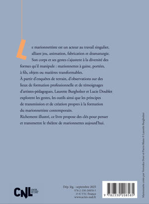 Le marionnettiste est un acteur au travail singulier, alliant jeu, animation, fabrication et dramaturgie. Son corps et ses gestes s'ajustent à la diversité des formes qu'il manipule : marionnettes à gaine, portées, à fils, objets ou matières transformables. À partir d'enquêtes de terrain, d'observations sur des lieux de formation professionnelle et de témoignages d'artistes-pédagogues, Laurette Burgholzer et Lucie Doublet explorent les gestes, les outils ainsi que les principes de transmission et de création propres à la formation du marionnettiste contemporain. Richement illustré, ce livre propose des clés pour penser et transmettre le théâtre de marionnettes aujourd'hui.
