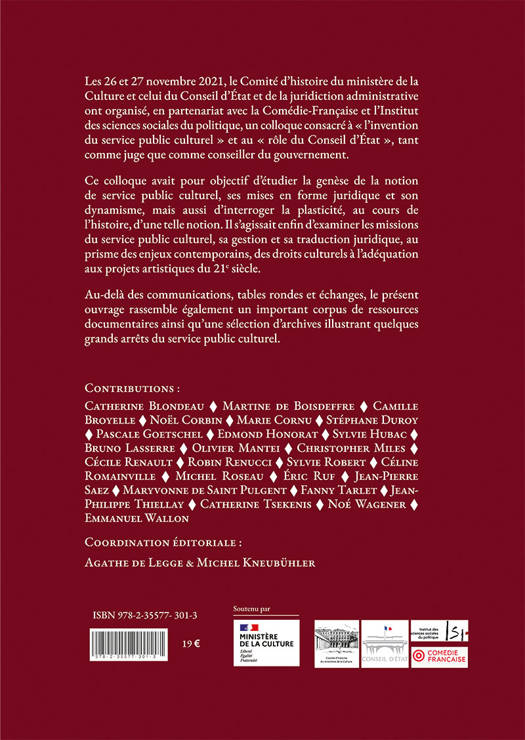 Les 26 et 27 novembre 2021, le Comité d'histoire du ministère de la Culture et celui du Conseil d'État et de la juridiction administrative ont organisé, en partenariat avec la Comédie-Française et l'Institut des sciences sociales du politique, un colloque consacré à « l'invention du service public culturel » et au « rôle du Conseil d'État », tant comme juge que comme conseiller du gouvernement, dans les politiques publiques de la culture. Ce colloque avait pour objectif d'étudier la genèse de la notion de service public culturel, ses mises en forme juridiques et son dynamisme, mais aussi d'interroger la plasticité, au cours de l'histoire, d'une telle notion. Il s'agissait enfin d'examiner les missions du service public culturel, sa gestion et sa traduction juridique, au prisme des enjeux contemporains, des droits culturels à l'adéquation aux projets artistiques du 21e siècle. COMMENT ? Le livre L'Artiste, l'administrateur et le juge reprend l'ensemble des communications du colloque de novembre 2021 ainsi que la transcription des deux tables rondes organisées au Conseil d'État puis à la Comédie-Française. Il donne également à voir, sous forme d'un cahier spécial, l'exposition intitulée Le théâtre, service public. La technique juridique, la politique culturelle et le juge administratif au 20e siècle présentée lors de ces deux journées et propose aussi un important corpus de ressources documentaires sur le sujet. Au nombre des contributeurs on compte : - des juristes ou conseillers d'État : Martine de Boisdeffre, Maryvonne de Saint Pulgent, Camille Broyelle, Marie Cornu, Stéphane Duroy, Edmond Honorat, Sylvie Hubac, Bruno Lasserre, Céline Romainville, Fanny Tarlet, Noé Wagener ; - des responsables de politiques culturelles au niveau national ou territorial : Noël Corbin, Christopher Miles, Sylvie Robert : - des directeurs ou directrices d'établissements culturels : Catherine Blondeau, Olivier Mantei, Cécile Renault, Robin Renucci, Michel Roseau, Éric Ruf, Jean-Philippe Thiellay, Catherine Tsekenis ; - des experts des politiques culturelles : Pascale Goetschel, Jean-Pierre Saez, Emmanuel Wallon.