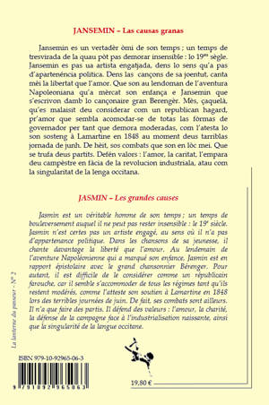Volume 2 des Papillotes de Jasmin. Extrait de l'avant-propos : Jasmin est un véritable homme de son temps ; un temps de bouleversement auquel il ne peut pas rester insensible : le 19e siècle. Jasmin n’est certes pas un artiste engagé, au sens où il n’a pas d’appartenance politique. Dans les chansons de sa jeunesse, il chante davantage la liberté que l’amour. Au lendemain de l’aventure Napoléonienne qui a marqué son enfance, Jasmin est en rapport épistolaire avec le grand chansonnier Bérenger. Pour autant, il est difficile de le considérer comme un républicain farouche, car il semble s’accommoder de tous les régimes tant qu’ils restent modérés, comme l’atteste son soutien à Lamartine en 1848 lors des terribles journées de juin. De fait, ses combats sont ailleurs. Il n’a que faire des partis. Il défend des valeurs : l’amour, la charité, la défense de la campagne face à l’industrialisation naissante, ainsi que la singularité de la langue occitane. Cette publication, inédite en Français/occitan-gascon, se présente avec chacune des deux langues en regard, pour une meilleure lecture comparée.