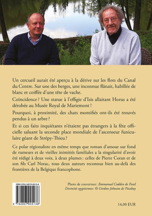 Un cercueil aurait été aperçu à la dérive sur les flots du Canal du Centre. Sur une des berges, une inconnue flânait, habillée de blanc et coiffée d’une tête de vache. Coïncidenceâ? Une statue à l’effigie d’Isis allaitant Horus a été dérobée au Musée Royal de Mariemont ! Pourquoi, à proximité, des chats momifiés ont-ils été trouvés pendus à un arbreâ? Et si ces faits inquiétants n’étaient pas étrangers à la fête officielle saluant la seconde place mondiale de l’ascenseur funiculaire géant de Strépy-Thieuâ? Publié une première fis il y a 20 ans, ce bref roman policier et d’amour sur fond de rumeurs a la singularité d’avoir été rédigé à deux voix. Auteurs chacun de plus de 100 ouvrages, Pierre Coran et son fils Carl Norac font partie des eÌcrivains belges les plus connus, tant en Belgique qu’aÌ l’international, laureÌats de nombreux prix en France et en Belgique, particulieÌrement dans le domaine de la litteÌrature jeunesse et de la poeÌsie (Carl Norac a eÌteÌ « poeÌte national »).