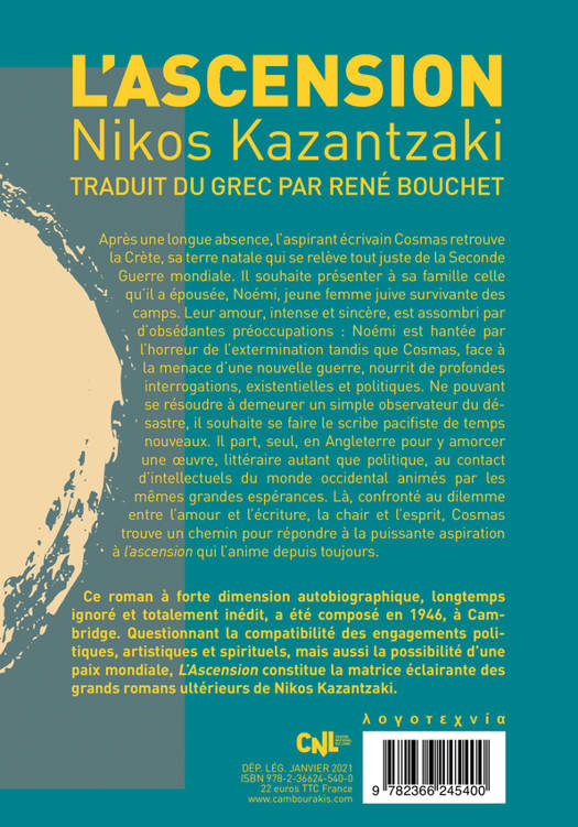 Après une longue absence, l'aspirant écrivain Cosmas retrouve la Crète, sa terre natale qui se relève tout juste de la Seconde Guerre mondiale. Il souhaite présenter à sa famille celle qu'il a épousée, Noémi, jeune femme juive survivante des camps. Leur amour, intense et sincère, est assombri par d'obsédantes préoccupations : Noémi est hantée par l'horreur de l'extermination tandis que Cosmas, face à la menace d'une nouvelle guerre, nourrit de profondes interrogations, existentielles et politiques. Ne pouvant se résoudre à demeurer un simple observateur du désastre, il souhaite se faire le scribe pacifiste de temps nouveaux. Il part, seul, en Angleterre pour y amorcer une oeuvre, littéraire autant que politique, au contact d'intellectuels du monde occidental animés par les mêmes grandes espérances. Là, confronté au dilemme entre l'amour et l'écriture, la chair et l'esprit, Cosmas trouve un chemin pour répondre à la puissante aspiration à l'ascension qui l'anime depuis toujours. Ce roman à forte dimension autobiographique, longtemps ignoré, a été composé en 1946, à Cambridge. Questionnant la compatibilité des engagements politiques, artistiques et spirituels, mais aussi la possibilité d'une paix mondiale, "L'Ascension" constitue la matrice éclairante des grands romans ultérieurs de Nikos Kazantzaki. Auteur d'une oeuvre considérable, qui embrasse tous les genres - roman, essai philosophique, théâtre et poésie - Nikos Kazantzaki, né en Crète en 1883, est incontestablement l'une des figures les plus marquantes de la littérature grecque moderne.