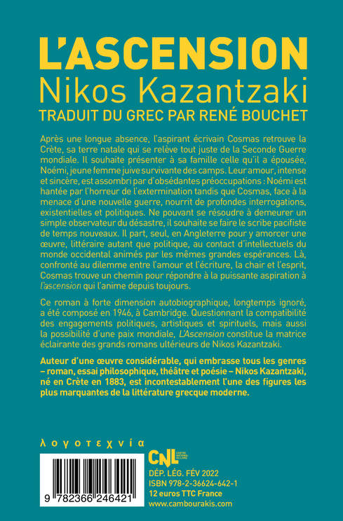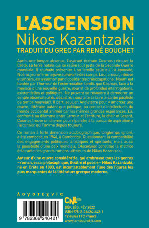 Réédition en poche du dernier roman inédit de Nikos Kazantzaki, paru en grand format en 2020. Écrit en 1946, au cours d'un voyage effectué en Angleterre dans le but de fonder une internationale de l'esprit, ce roman suit Cosmas, un jeune écrivain en devenir. D'abord en Crète, dans les immédiats de l'après-guerre, où il retrouve sa famille à qui il veut présenter sa fiancée. Puis en Angleterre, où il se rend pour se consacrer à l'écriture et rencontrer nombre d'intellectuels européens. Tiraillé entre le devoir de retourner aux côtés de sa jeune épouse enceinte, certaines tentations féminines et la volonté profonde de se consacrer à son grand oeuvre, ce personnage est emblématique des questionnements qui animeront nombre de personnages de Kazantzaki dans des romans ultérieurs.
