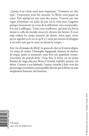 Avec Les chroniques du Shérif, La queue du chat sur le tourne-disque, Un temps de cochon, Christophe Sigognault, homme de théâtre, de cirque, poète et romancier, nous livre son quatrième roman : L'ascension du pied-de-biche. Cette fois, le héros est un jeune Parisien de vingt-cinq ans, Bruno Connard, orphelin, paumé, à la dérive. Comme à son habitude, l'auteur s'attache à faire vivre des personnages secondaires remarquables dévorés par la bêtise ou tout simplement humains, très humains.