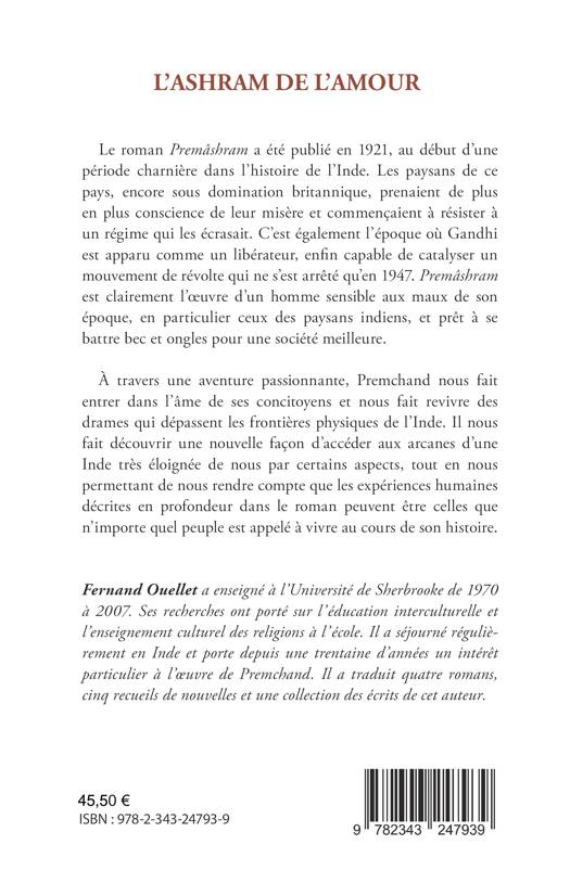 Le roman Premâshram a été publié en 1921, au début d’une période charnière dans l’histoire de l’Inde. Les paysans de ce pays, encore sous domination britannique, prenaient de plus en plus conscience de leur misère et commençaient à résister à un régime qui les écrasait. C’est également l’époque où Gandhi est apparu comme un libérateur, capable de catalyser un mouvement de révolte qui ne s’est arrêté qu’en 1947. Premâshram est l’oeuvre d’un homme sensible aux maux de son époque et prêt à se battre bec et ongles pour une société meilleure. À travers une aventure passionnante, Premchand nous fait entrer dans l’âme de ses concitoyens, nous fait revivre des drames qui dépassent les frontières physiques de l’Inde, tout en nous permettant de nous rendre compte que les expériences humaines décrites peuvent être celles que n’importe quel peuple est appelé à vivre au cours de son histoire.