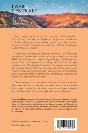 Région d'extraordinaire richesse ethnique et culturelle, de par son positionnement à la lisière d'influences historiques turques, persanes, indiennes, mais aussi chinoises, russes, méditerranéennes, l'Asie centrale mérite un renouveau d'attention. Aux cinq pays d’Asie centrale : Turkménistan, Ouzbékistan, Tadjikistan, Kirghizistan, Kazakhstan, l'ouvrage inclut dans l'analyse l’Azerbaïdjan en tant que pays caucasien riverain de la Mer Caspienne au centre des intérêts énergétiques fondamentaux de la région. Trois perspectives sont réunies : histoire sur plus 40 000 ans ; aspects socio-économiques des pays qui la composent soumis à l’autorité religieuse de la muftiyya de Tachkent à l’époque soviétique ; évaluation des perspectives ouvertes par l’initiative chinoise des nouvelles routes de la Soie.