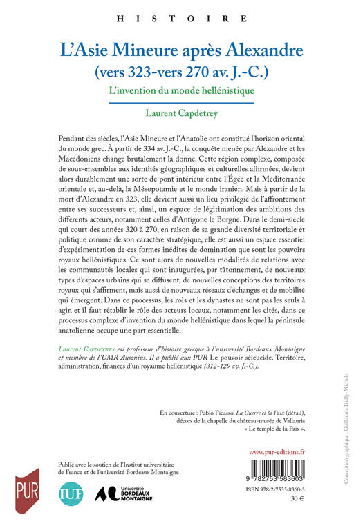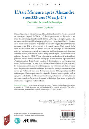 Pendant des siècles, l'Asie Mineure et l'Anatolie ont constitué l'horizon oriental du monde grec. À partir de 334 av. J.-C., la conquête menée par Alexandre et les Macédoniens change brutalement la donne. Cette région complexe, composée de sous-ensembles aux identités géographiques et culturelles affirmées, devient alors durablement une sorte de pont intérieur entre l'Égée et la Méditerranée orientale et, au-delà, la Mésopotamie et le monde iranien. Mais à partir de la mort d'Alexandre en 323, elle devient aussi un lieu privilégié de l'affrontement entre ses successeurs et, ainsi, un espace de légitimation des ambitions des différents acteurs, notamment celles d'Antigone le Borgne. Dans le demi-siècle qui court des années 320 à 270, en raison de sa grande diversité territoriale et politique comme de son caractère stratégique, elle est aussi un espace essentiel d'expérimentation de ces formes inédites de domination que sont les pouvoirs royaux hellénistiques. Ce sont alors de nouvelles modalités de relations avec les communautés locales qui sont inaugurées, par tâtonnement, de nouveaux types d'espaces urbains qui se diffusent, de nouvelles conceptions des territoires royaux qui s'affirment, mais aussi de nouveaux réseaux d'échanges et de mobilité qui émergent. Dans ce processus, les rois et les dynastes ne sont pas les seuls à agir, et il faut rétablir le rôle des acteurs locaux, notamment les cités, dans ce processus complexe d'invention du monde hellénistique dans lequel la péninsule anatolienne occupe une part essentielle.
