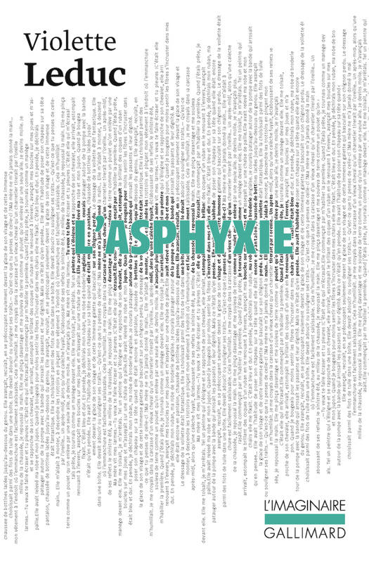 "Ma mère ne m'a jamais donné la main..." Tout est dit dès la première phrase du roman. L'asphyxie, c'est une enfance étouffée, le poids d'une faute, une blessure, un mal d'aimer incessant, des larmes, mais aussi une musique de rue, une poupée brisée, un cornet de frites, un parfum d'orange... Parce qu'un enfant n'a pas conscience du temps, L'asphyxie n'a pas de chronologie propre. Ce sont des soubresauts d'émotions, des coups d'oeil de la mère sur sa fille, le regard "dur et bleu", des gifles de mots. Dans son tout premier ouvrage, Violette Leduc dévoile déjà un style incisif, et plante la figure maternelle comme la proue énigmatique de son grand navire.