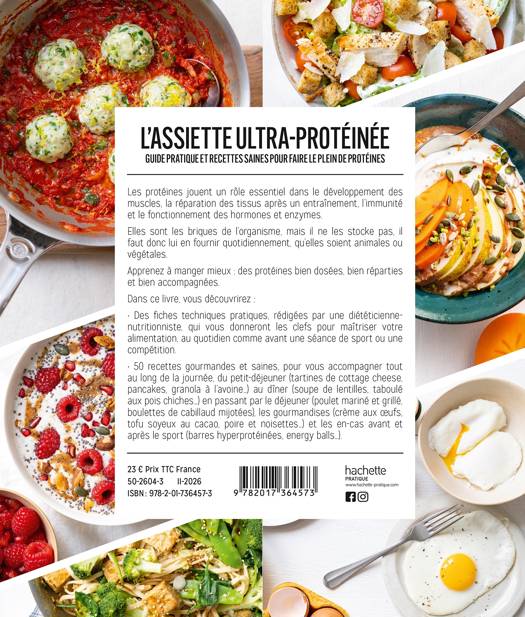 - 50 recettes gourmandes et saines, pour vous accompagner tout au long de la journée, du petit-déjeuner (tartines de cottage cheese, pancakes, granola à l’avoine…) au dîner (soupe de lentilles, taboulé aux pois chiches…) en passant par le déjeuner (poulet mariné et grillé, boulettes de cabillaud mijotées), les gourmandises (crème aux oeufs, tofu soyeux au cacao, poire et noisettes…) et les en-cas avant et après le sport (barres hyperprotéinées, energy balls…).