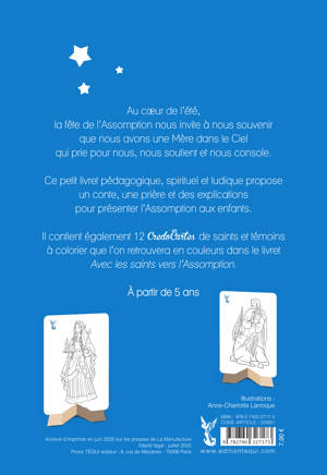 Un pendant chrétien aux cartes Pokémon : 12 cartes de saints à colorier et à collectionner avec leur support. D'autres CredoCartes sont disponibles dans "Avec les saints vers la Toussaint", "La Toussaint à colorier", "Avec les saints vers Noël", "Noël à colorier", "Avec les saints vers Pâques", "Pâques à colorier", "Avec les saints vers l'Ascension et la Pentecôte", "L'Ascension et la Pentecôte à colorier", "Avec les saints vers l'Assomption" + dans le numéro 511 de "Patapon". Un conte et une catéchèse pour compléter les 12 vies de saints du livret "Avec les saints vers l'Assomption". Saint Antoine de Padoue, sainte Bernadette de Lourdes, sainte Clotilde, saint Jean Bosco, saint Francesco de Fatima, sainte Ombeline, saint Stanislas Kostka, Marcel Van, Zélie Martin, saint Louis-Marie Grignion de Montfort, saint Luc l'évangéliste, saint Juanito de Guadalupe.