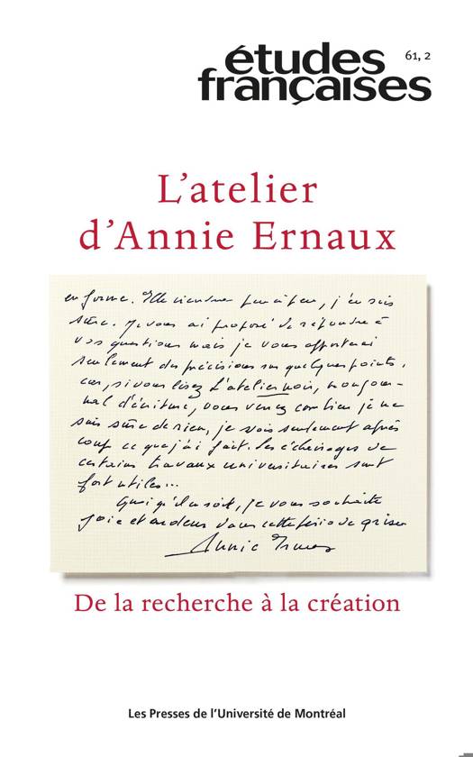 Les contributions permettent ainsi d'explorer les indices du savoir-faire de l'écrivaine, à partir des avant-textes, des journaux de création, des entretiens et de l'ensemble du corps de l'oeuvre qui se déploie en une vie d'écriture. La fabrique de l'oeuvre sans cesse réfléchie au miroir d'une interrogation fondamentale sur l'écriture dévoile de fait des qualités génératives de premier plan pour la recherche-création littéraire, comme en témoigne la place d'Annie Ernaux dans plusieurs thèses et mémoires.