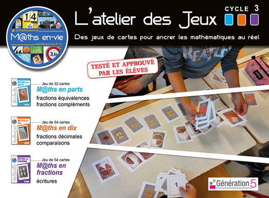 Maths en-vie - L’Atelier des Jeux (Fractions) est destiné au cycle 3. Il invite les élèves à jouer en autonomie ou en atelier, à des activités ludiques, motivantes et stimulantes. Cette démarche vient en complément de l'approche traditionnelle de l'apprentissage des mathématiques, lors des phases de découverte, de structuration d'une notion ou encore d'entrainement. Cette boite comprend 3 jeux de cartes distincts basés sur les fractions permettant de réaliser 6 activités ainsi qu’un livret A5 pour l’enseignant et des fiches pour les élèves.