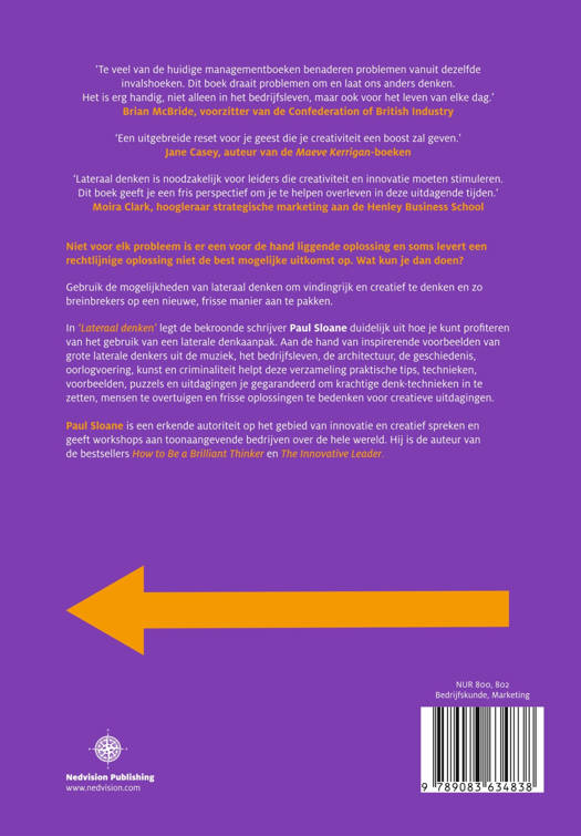 ‘Lateraal denken is noodzakelijk voor leiders die creativiteit en innovatie moeten stimuleren. Dit boek geeft je een fris perspectief om je te helpen overleven in deze uitdagende tijden.’ Moira Clark, hoogleraar strategische marketing aan de Henley Business School