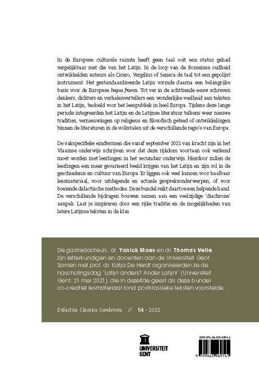 De vakspecifieke eindtermen die vanaf september 2021 van kracht zijn in het Vlaamse onderwijs schrijven voor dat deze rijkdom voortaan ook verkend moet worden met leerlingen in het secundair onderwijs. Hierdoor zullen de leerlingen een meer gevarieerd beeld krijgen van het Latijn en zijn rol in de geschiedenis en cultuur van Europa. Er liggen ook veel kansen voor haalbaar leesmateriaal, voor uitdagende en actuele gespreksonderwerpen, of voor boeiende didactische methodes. Deze bundel reikt daartoe een helpende hand. De verschillende bijdragen bouwen samen aan een veelzijdige ‘diachrone’ aanpak. Laat je inspireren door een rijke traditie en de mogelijkheden van latere Latijnse teksten in de klas.