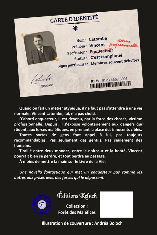 Quand on fait un métier atypique, il ne faut pas s'attendre à une vie normale. Vincent Latombe, lui, n'a pas choisi. D'abord enquesteur, il est devenu, par la force des choses, victime professionnelle. Depuis, il s'expose volontairement aux dangers qui rôdent, aux forces maléfiques, en prenant la place des innocents ciblés. Toutes sortes de gens font appel à lui, pas toujours recommandables. Pas seulement des gentils. Pas seulement des humains. Tiraillé entre deux mondes, entre la noirceur et la bonté, Vincent pourrait bien se perdre, et tout perdre au passage. À moins de mettre la main sur le Livre de la Vie. Une novella fantastique qui met un enquêteur pas comme les autres aux prises avec des forces qui le dépassent.