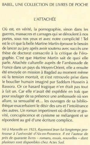 Où est, en vérité, la pornographie, sinon dans les guerres, massacres et carnages qui se déroulent à nos portes, sous nos yeux et avec notre complicité ! Tel est le cri que la belle Martine Martin éprouve le besoin de lancer au jury après avoir soutenu avec succès une thèse de doctorat consacrée à la critique de l'éro-graphie. C'est que Martine Martin sait de quoi elle parle. Attachée culturelle auprès de l'ambassade de France dans un pays du Moyen-Orient, elle a ensuite été envoyée en mission à Bagdad au moment même où la tension montait, et s'est retrouvée prise dans le bouclier humain imaginé par Saddam Hussein à Bassora. Or ce hasard tragique n'en était pas tout à fait un. Car elle n'avait été expédiée en Irak que pour soulager de sa présence une ambassade où son allure, sa sensualité et... les ouvrages de sa bibliothèque exacerbaient le désir des uns et l'intolérance des autres. Un roman impertinent où drôlerie et gravité, concupiscence et cynisme se mélangent et se répondent au gré d'une écriture complice.