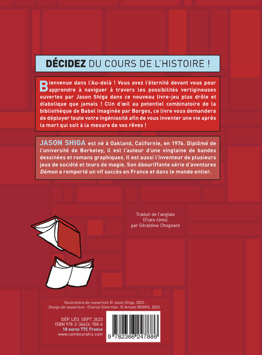 Bienvenue dans l'Au-delà ! Vous avez l'éternité devant vous pour apprendre à naviguer à travers les possibilités vertigineuses ouvertes par Jason Shiga dans ce nouveau livre-jeu plus drôle et diabolique que jamais ! Clin d'oeil au potentiel combinatoire de la bibliothèque de Babel imaginée par Borges, ce livre vous demandera de déployer toute votre ingéniosité afin de vous inventer une vie après la mort qui soit à la mesure de vos rêves !