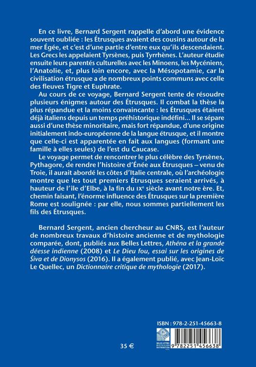 En ce livre, Bernard Sergent rappelle d'abord une evidence Bernard Sergent souvent oubliee: les Etrusques avaient des cousins autour de la mer Egee, et c'est d'une partie d'entre eux qu'ils descendaient. Les Grecs les appelaient Tyrsenes, puis Tyrrhenes. L'auteur etudie ensuite leurs parentes culturelles avec les Minoens, les Myceniens, l'Anatolie, et, plus loin encore, avec la Mesopotamie, car la civilisation etrusque a de nombreux points communs avec celle des fleuves Tigre et Euphrate. Au cours de ce voyage, Bernard Sergent tente de resoudre plusieurs enigmes autour des Etrusques. Il combat la these la plus repandue et la moins convaincante: les Etrusques etaient deja italiens depuis un temps prehistorique indefini Il se separe aussi d'une these minoritaire, mais fort repandue, d'une origine initialement indo-europeenne de la langue etrusque, et il montre que celle-ci est apparentee en fait aux langues (formant une famille a elles seules) de l'est du Caucase. Le voyage permet de rencontrer le plus celebre des Tyrsenes, Pythagore, de rendre l'histoire d'Enee aux Etrusques - venu de Troie, il aurait aborde les cotes d'Italie centrale, ou l'archeologie montre que les tout premiers Etrusques seraient arrives, a hauteur de l'ile d'Elbe, a la fin du IXe siecle avant notre ere. Et, chemin faisant, l'enorme influence des Etrusques sur la premiere Rome est soulignee: par elle, nous sommes partiellement les fils des Etrusques.