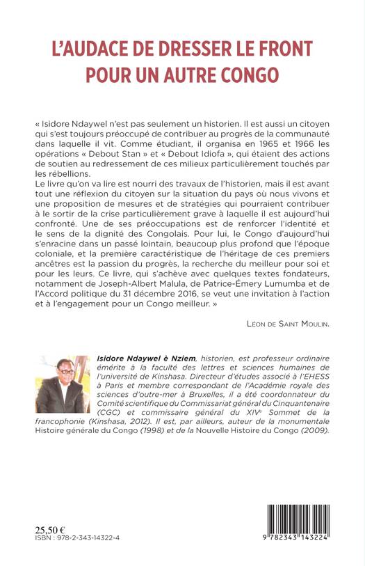 "Ce livre est nourri des travaux de l'historien Isidore Ndaywel, mais il est avant tout une réflexion du citoyen sur la situation de la République démocratique du Congo et une proposition de mesures et de stratégies qui pourraient contribuer à sortir ce pays de la crise particulièrement grave à laquelle il est aujourd'hui confronté. Une de ses préoccupations est de renforcer l'identité et le sens de la dignité des congolais. Ce livre se veut une invitation à l'action et à l'engagement pour un Congo meilleur". Léon de Saint-Moulin