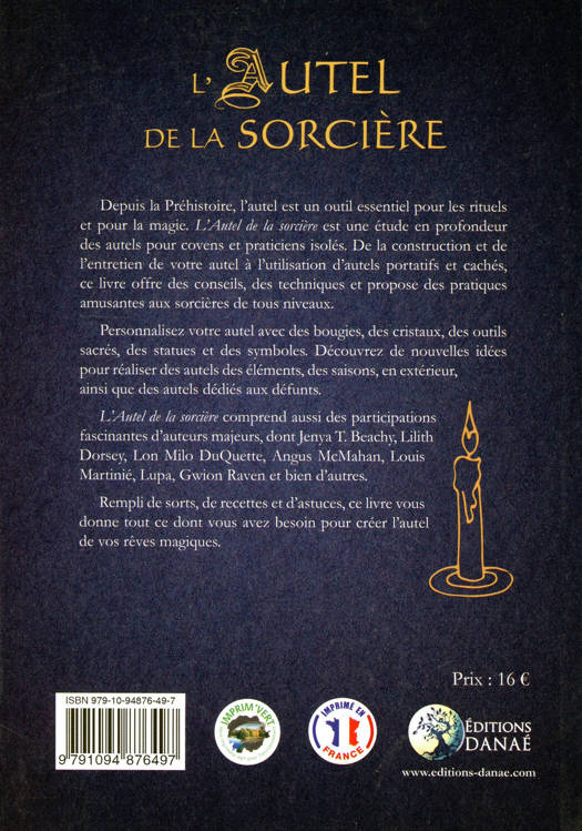 Depuis la Préhistoire, l’autel est un outil essentiel pour les rituels et pour la magie. L’Autel de la Sorcière est une étude en profondeur des autels pour covens et praticiens isolés. De la construction et de l’entretien de votre autel à l’utilisation d’autels portatifs et cachés, ce livre offre des conseils, des techniques et propose des pratiques amusantes aux sorciers et sorcières de tous niveaux. Personnalisez votre autel avec des bougies, des cristaux, des outils sacrés, des statues et des symboles. Découvrez de nouvelles idées pour réaliser des autels des éléments, des saisons, en extérieur, ainsi que des autels dédiés aux défunts. L’Autel de la Sorcière comprend aussi des participations fascinantes d’auteurs majeurs, dont Jenya T. Beachy, Lilith Dorsey, Lon Milo DuQuette, Angus McMahan, Louis Martinié, Lupa, Gwion Raven, et bien d’autres. Rempli de sorts, de recettes, et d’astuces, ce livre vous donne tout ce dont vous avez besoin pour créer l’autel de vos rêves magiques.