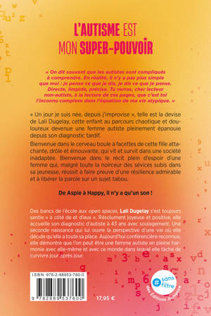 « On dit souvent que les autistes sont compliqués à comprendre. En réalité, il n’y a pas plus simple que moi : je pense ce que je dis, je dis ce que je pense. Directe, limpide, précise. Tu verras, cher lecteur non-autiste, à la lecture de ces pages, que c’est toi l’inconnu complexe dans l’équation de ma vie atypique. »