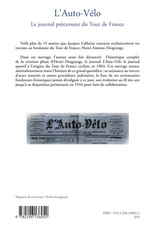 Cet ouvrage nous fait découvrir l'historique complet de la création phare d'Henri Desgrange, le journal L'auto-Vélo, le journal sportif à l'origine du Tour de France cycliste en 1903. Cet ouvrage retrace méticuleusement toute l'histoire de ce grand quotidien : sa naissance au travers d'actes notariés et autres procédures judiciaires, la liste de ses actionnaires fondateurs historiques jamais divulguée à ce jour, son évolution au fil des ans jusqu'à sa disparition prématurée en 1944 pour faits de collaboration.