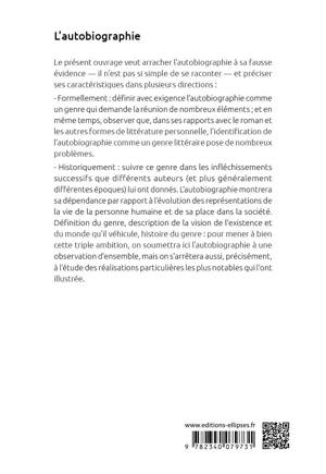 - Formellement : définir avec exigence l'autobiographie comme un genre qui demande la réunion de nombreux éléments ; et en même temps, observer que, dans ses rapports avec le roman et les autres formes de littérature personnelle, l'identification de l'autobiographie comme un genre littéraire pose de nombreux problèmes.