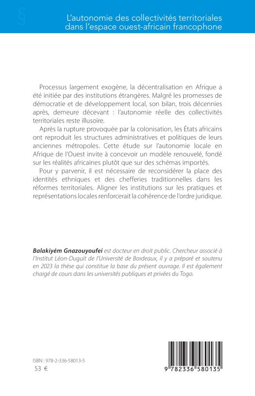 Processus largement exogène, la décentralisation en Afrique a été initiée par des institutions étrangères. Malgré les promesses de démocratie et de développement local, son bilan, trois décennies après, demeure décevant: l'autonomie réelle des collectivités territoriales reste illusoire. Après la rupture provoquée par la colonisation, les États africains ont reproduit les structures administratives et politiques de leurs anciennes métropoles. Cette étude sur l'autonomie locale en Afrique de l'Ouest invite à concevoir un modèle renouvelé, fondé sur les réalités africaines plutôt que sur des schémas importés. Pour y parvenir, il est nécessaire de reconsidérer la place des identités ethniques et des chefferies traditionnelles dans les réformes territoriales. Aligner les institutions sur les pratiques et représentations locales renforcerait la cohérence de l'ordre juridique.