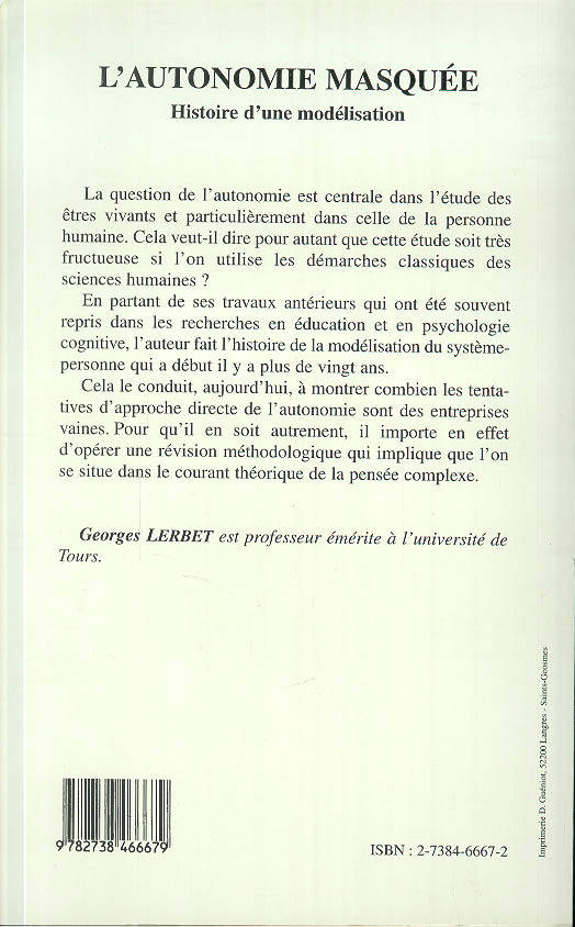 En partant de ses travaux antérieurs, l'auteur fait l'histoire de la modélisation du système-personne qui a débuté il y a plus de vingt ans. Cela le conduit, aujourd'hui, à montrer combien les tentatives d'approche directe de l'autonomie sont des entreprises vaines. Pour qu'il en soit autrement, il importe en effet d'opérer une révision méthodologique qui implique que l'on se situe dans le courant théorique de la pensée complexe.