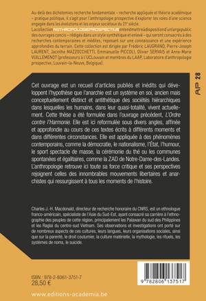 Qu'est-ce que l'anarchie ? Ce livre répond à cette question à travers l'étude anthropologique de collectifs et de situations diverses. En partant de la logique qui commande l'ordre anarchique, en opposition à l'ordre social et politique des sociétés contemporaines, il éclaire d'une lumière pénétrante des phénomènes comme l'humour ou l'amitié, mais aussi des structures sociales comme l'État et la démocratie. L'anthropologie critique rejoint ici les thèses libertaires.