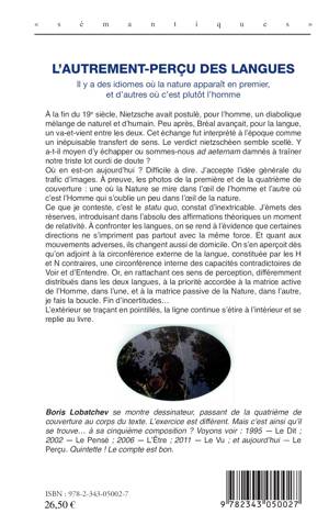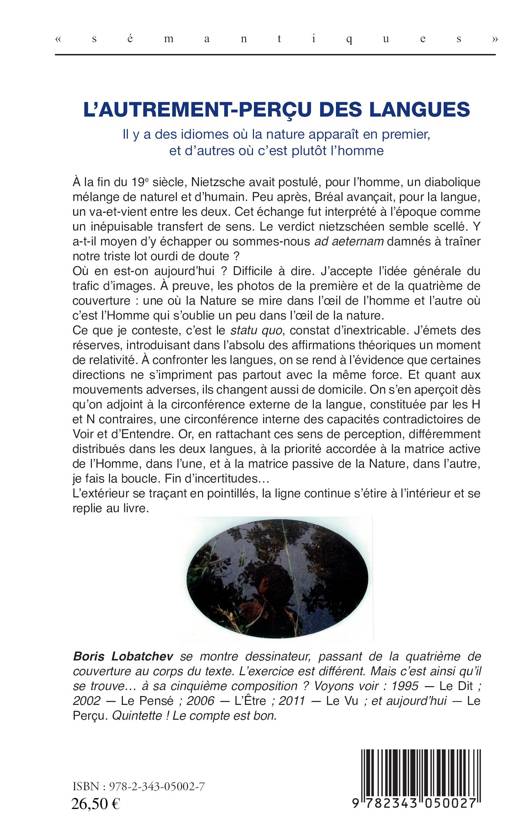 Nietzsche postulait, pour l'homme, un piètre mélange de naturel et d'humain. Où en est-on ? La Nature se mire dans l'œil de l'homme, l'Homme s'oublie dans l'œil de la nature. Le trafic d'images est ainsi accepté. L'auteur ne conteste que l'absolu des affirmations théoriques, y introduisant leur relativité… qu'est le perçu des langues.