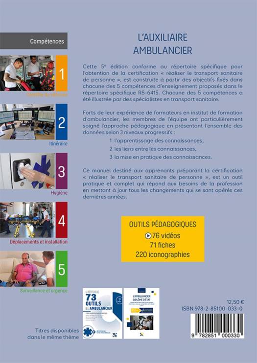 Cette 5e édition conforme au répertoire spécifique pour l'obtention de la certification « réaliser le transport sanitaire de personne », est construite à partir des objectifs fixés dans chacune des 5 compétences d'enseignement proposés dans le répertoire spécifique RS-6415. Chacune des 5 compétences a été illustrée par des spécialistes en transport sanitaire.