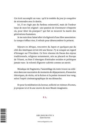 « Cet écrit accomplit un vœu : qu’à la tombée du jour je conquière de m’entendre avec le destin. Ici, il ne s’agit pas du fardeau existentiel, mais de l’ardeur issue de mon lot originel : une passion de s’aventurer n’importe où, pour tâter du pourquoi ? qui fait se mouvoir la marée des générations humaines. Je me suis donc laissé aller à la légèreté d’une libre association. Le temps n’efface rien, il refoule pour désencombrer le présent. (…) » P.L.